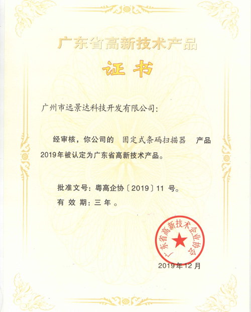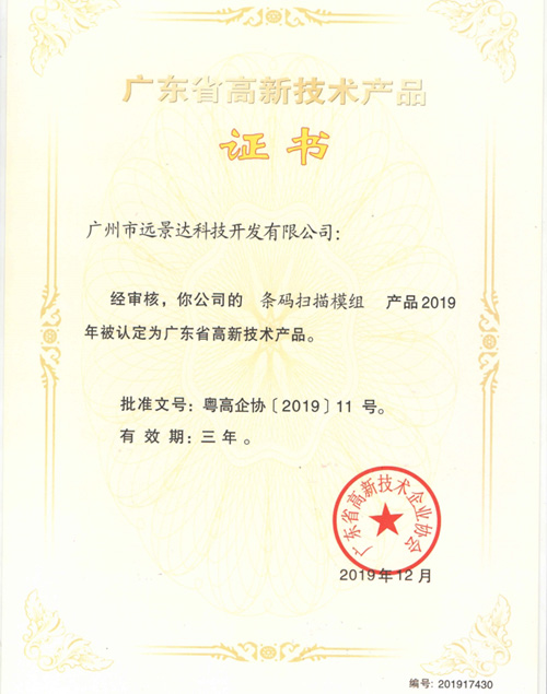 特大喜訊!經廣東省高新技術企業協會嚴格審核,遠景達科技(RAKINDA)自主研發的《條碼掃描模組》和《固定式條碼掃描器》在2019年被認定為廣東省高新技術產品,這標志著公司在技術創新方面取得了新成績。