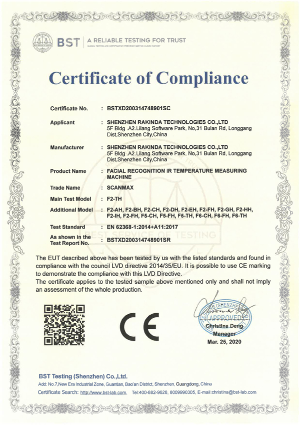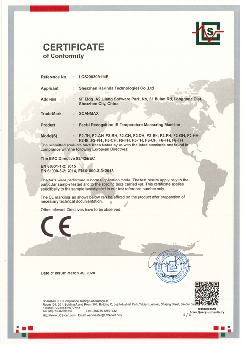 深圳遠(yuǎn)景達(dá)物聯(lián)網(wǎng)科技有限公司(簡稱"ScanMax遠(yuǎn)景達(dá)物聯(lián)")自主研發(fā)和生產(chǎn)的人臉識別測溫門禁一體機(jī)(測溫人臉識別終端),獲得“CE”認(rèn)證啦,我司的產(chǎn)品可更好地投入到助力海外疫情防控工作中,讓防疫工作更省心、更安全!目前,該系列的人臉識別測溫產(chǎn)品已批量投入于市場使用,廣泛應(yīng)用在國內(nèi)外抗疫一線中的各行業(yè)和多種場景中,大受客戶贊譽(yù),請放心選購!同時ScanMax遠(yuǎn)景達(dá)物聯(lián)也可根據(jù)您的需求而定制,代理商更是有很大的空間(包括產(chǎn)品、價格、質(zhì)量有保障等),歡迎各界的朋友來代理我們的一線產(chǎn)品。