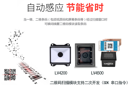 (2)LV4500二維碼掃描頭模塊采用了自主研發(fā)的智能核心解碼技術,大視窗口極速掃描,可對所有的國際標準一維條碼和主流二維碼進行識讀,掃描性能達到國際先進水平;特別針對當前主流的手機屏幕碼和紙面碼識讀在光線的掃描識讀作了特殊技術校驗,可輕松應對強光、弱光、反光和貼彩膜等各種環(huán)境下的條碼識讀。另外,LV4500還具有IP54工業(yè)等級的防塵防水功能,即使長期在環(huán)境較為陰暗和復雜的各種機器內部依然可以保有非常優(yōu)秀的識讀性能,所以非常受國內外眾多門禁安防集成廠商、通道閘機廠商、自助設備廠商的歡迎。