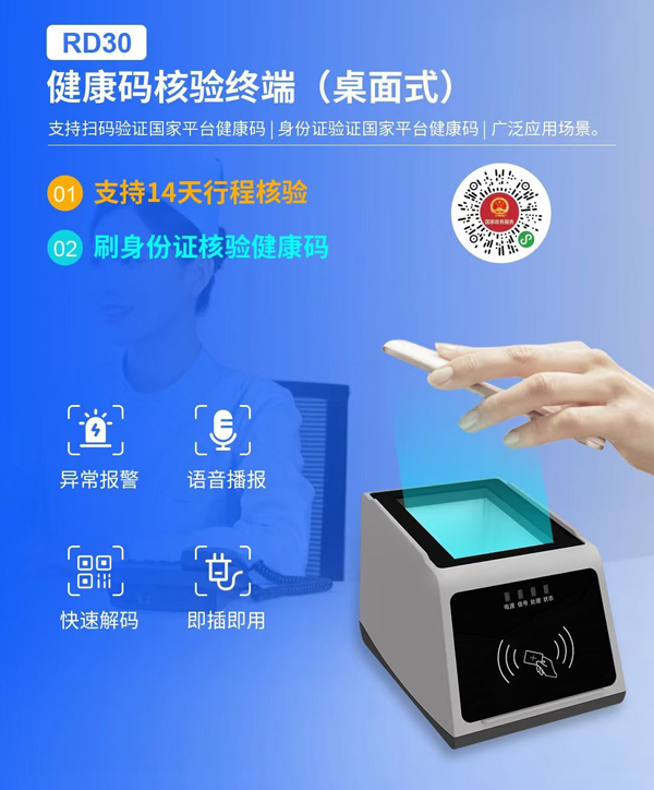 RD30健康碼掃碼核驗平臺的核心功能“健康碼核驗”,在提升安全性和性能的基礎上快速更新迭代,適配最新國家政務平臺機制,提供了覆蓋全國地區的基于掃碼/身份證調用檢測健康碼服務。該桌面式健康碼核驗設備的投入使用有效幫助了防控場景中人流量大、有許多老年人不會操作智能手機、或者無法出示健康碼,及需要高效率通行等問題,都具有顯著提升與改善。