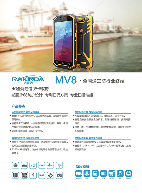 MV8物流數據采集終端(安卓條碼數據采集器),是一款性價比極高、功能強大的工業級手持終端,適用于倉庫庫存盤點中的入庫清點、物資上架、盤庫點倉、物資出庫、檢索查詢等各個環節的操作,實時上傳數據,降低人工操作的差錯率,方便管理層將實時情況作出相關對策。原裝進口的1D/2D條碼識讀引擎,讓“條碼掃描”更高效;三防工業等級IP68、5200mAh大電池,輕薄機身設計等功能,可輕松滿足一些惡劣倉儲環境中,如充滿灰塵、吵雜且光線昏暗等復雜環境下的應用需求。如果您有需求,歡迎咨詢訂購~