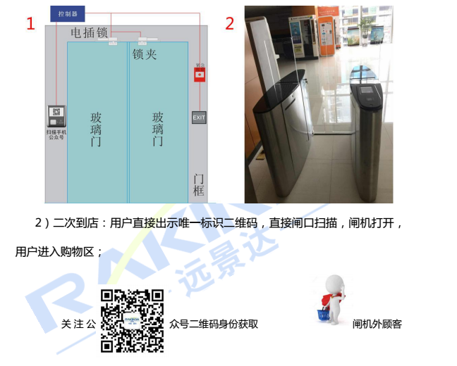 2)二次到店:用戶直接出示唯一標識二維碼,直接閘口掃描,閘機打開,用戶進入購物區;