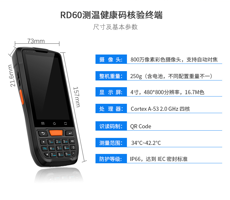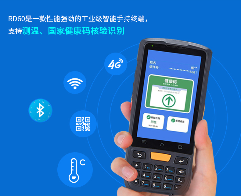RD60是一款性能強勁的工業級智能手持終端,支持測溫、國家健康碼核驗識別。基于Android 9.0操作系統開發,采用高性能處理器,四核CPU,支持雙頻WiFi和高速4G通訊,運行快速且省電。