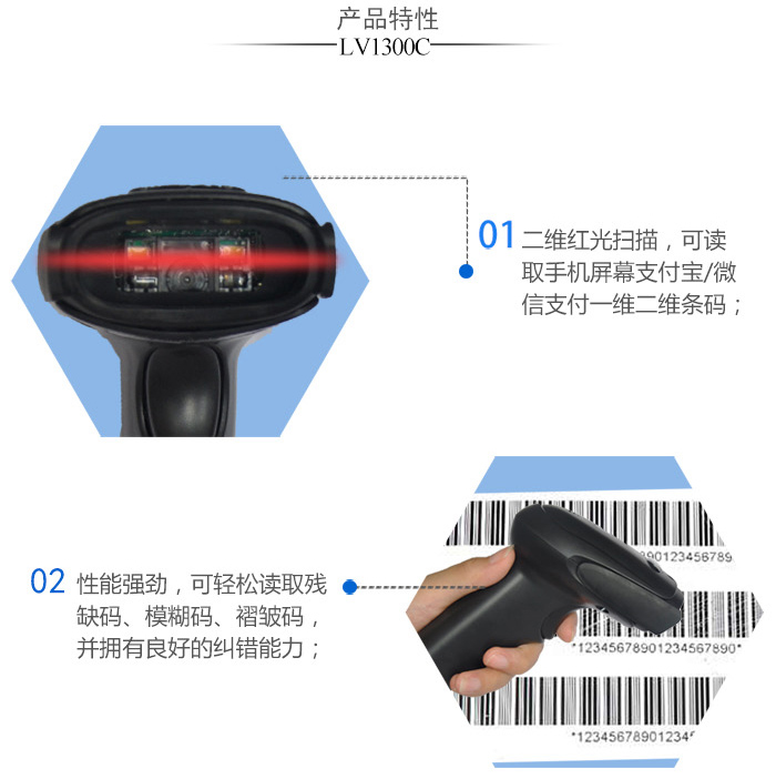 2、性能強勁,可輕松讀取殘缺碼、模糊碼、褶皺碼,并擁有良好的糾錯能力;