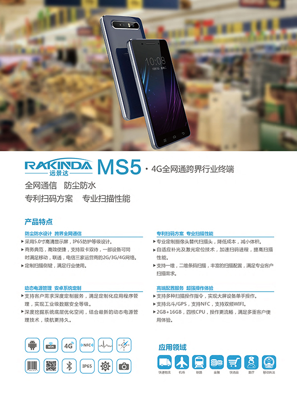 遠景達MX7在遠景達MS5的基礎(chǔ)上,功能和性能上實現(xiàn)了全面升級,可以更好地滿足客戶多方位需求。5.0吋高清屏、多點觸控電容屏;支持一維/二維條碼掃描、NFC等功能;雙卡雙待,4G全網(wǎng)通信,滿足不同網(wǎng)絡(luò)制式,雙WIFI性能更優(yōu);GPS和北斗雙星定位,靈活選擇;大容量電池,待機時間更長;微型定制攝像頭替代昂貴的專業(yè)掃描頭,指哪掃哪;遠景達MX7采用IP65防護等級能更好適應(yīng)惡劣環(huán)境;將傳統(tǒng)行業(yè)終端和普通手機的優(yōu)勢合二為一,可適應(yīng)于各類行業(yè)市場。