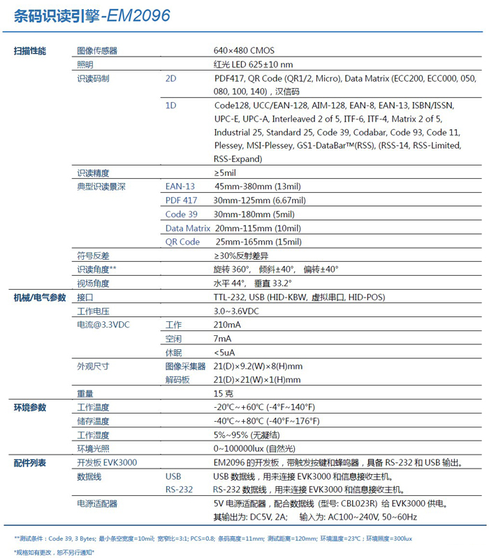 EM2096嵌入式條碼掃描模塊,采用卓越的智能核心解碼技術,并有效針對屏幕條碼識讀做了特殊校驗,可適應最低亮度以及各類貼膜的大數據量屏幕條碼。此外,EM2096系列二維碼掃描頭的圖像采集器與解碼板分立設計,安裝靈活,非常適用于對空間要求比較緊湊的終端應用,如PDA產品、金融POS終端、桌面掃描設備、自助查詢設備等。