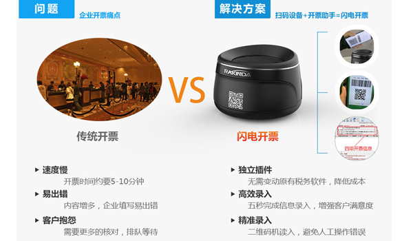 自2017年7月1日稅務總局增值稅開票新規出來后,商家的開票難度和時間成本劇增的同時也很容易開錯發票,一旦開票信息有誤,發票便作廢無法用于報銷。此情此景下,深圳遠景達(RAKINDA)推出了極速開票工具,完全顛覆了傳統的開票模式。用戶只需在支付寶、微信(或其他第三方開票軟件)上自行錄入開票信息,自動生成“開票二維碼”,將此“開票二維碼”置于RD4100極速開票終端上一掃即刻自行錄入到百旺金賦、航天信息稅控(或其他)開票界面,整個過程僅要5秒,是連鎖酒店、餐飲、加油站、商場和超市開票首選的極速開票神器。