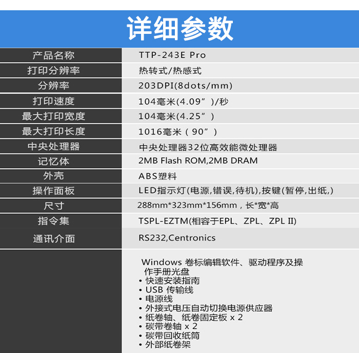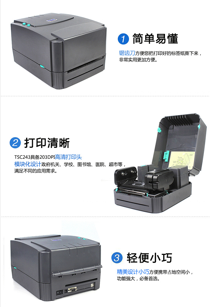 TSC TTP-243E PRO打印機以穩定耐用的機構設計、優異的性能,自推出市場以來廣受客戶青睞。該產品使用高階32位中央微處理器,讓數據處理與輸出打印更加快速順暢;203dpi分辨率,打印速度最高可達每秒4英寸精致的外觀,彰顯品牌的氣質;標準內建8MB DRAM/4MB Flash ROM內存,讓您可以更加輕松處理圖型數據及儲存字型。