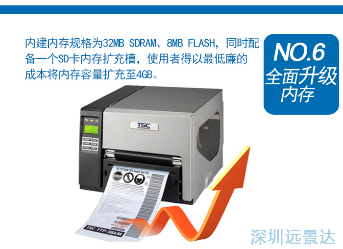 TSC TTP-384M主要特色:鋁合金鑄造機身搭配金屬外殼與透明窗口碳帶容量600公尺標簽耗材最大外徑8.2英吋;大型液晶顯示屏(含背光顯示) 配備6個操作按鈕標準配備包含串行端口、并列端口、內(nèi)部以太網(wǎng)絡打印服務器、USB 2.0和PS/2鍵盤連接接口;內(nèi)建內(nèi)存32 MB SDRAM、8 MB Flash和一個SD卡內(nèi)存擴展槽;人性化的高階打印機語言最佳的軟件兼容環(huán)境,內(nèi)建可以重設大小的向量字體,可仿真其他品牌條形碼。