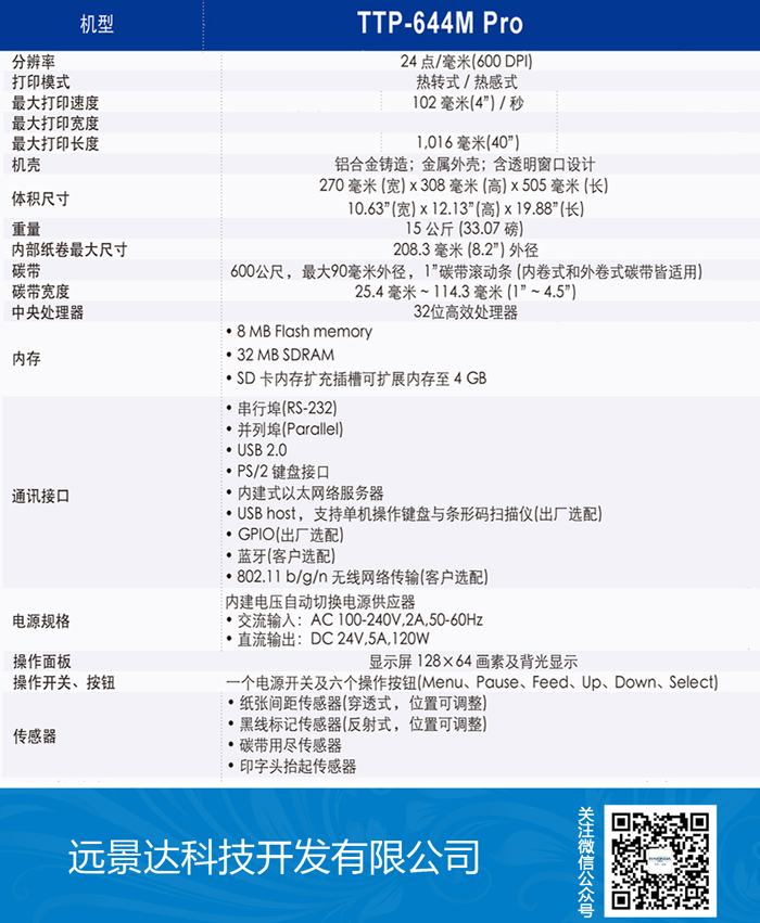 TSC TTP-644M(600DPI)工業級高清條碼打印機,打印速度高達每秒12英吋,系同等級機種中最高速的條形碼打印機。標準配備包含內部以太網絡打印服務器、USB2.0和PS/2鍵盤 連接接口;內建內存規格為32 MB DRAM、8 MB FLASH和一個SD卡的內存擴充槽,使用者得以最經濟的成本將內存容量擴充至4 GB。碳帶容量最大長度可達600公尺;標簽耗材最大外徑208公分(8.2英吋)。一體成型的鋁合金鑄造機臺,不論處理急迫性的大量打印或是單一批量打 印,TTP-644M 都能以絕佳的質量、效率及穩定度來完成您每一次的打印任務。